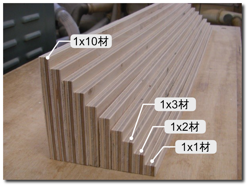 このようにして,合板の厚さ 1 に対して幅 2 とすると,この材料を 1× 2(ワンバイツー)と呼び,合板の幅nを 1〜10 に材料取りした規格材のことを 1 × n材と呼びます。 他にも,1 × n材と 1 ×n材の規格材をL 型やT 型に組み合わせて接着した材料をT型材(T 材)やL型材(L 材)と呼び,DL 材の種類に含めます。