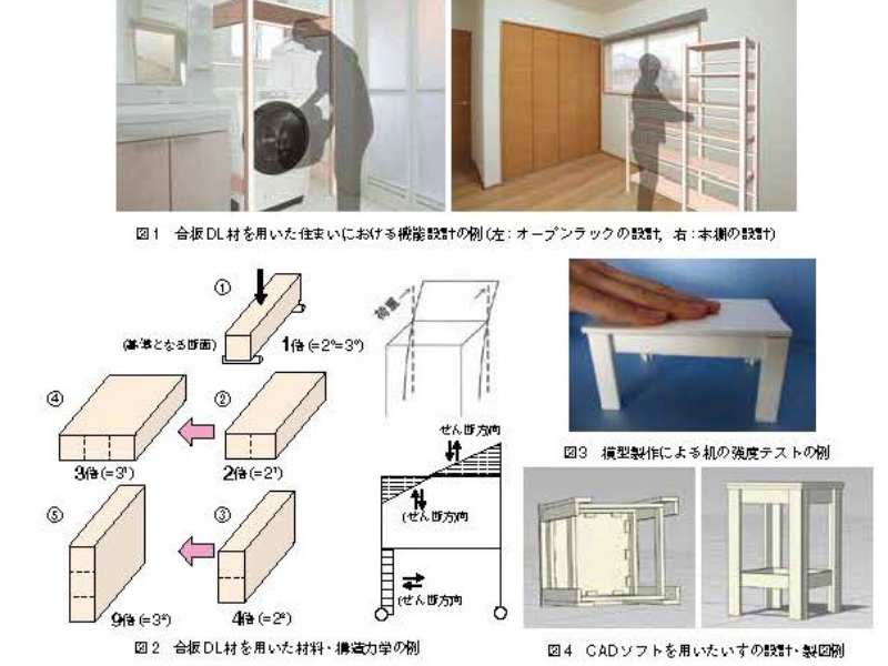 その他にも,規格材と相似形をした模型材を用いることによって,作りたいラックやいす,机のプロトタイプ(試作品)を作って設計に役立てることもできます。また,DL材の規格を登録したCADソフトを利用すれば,コンピュータを用いて,簡単にDL材を用いた設計・製図を行うことができます。