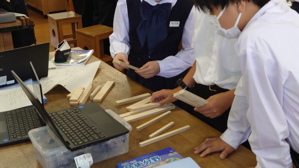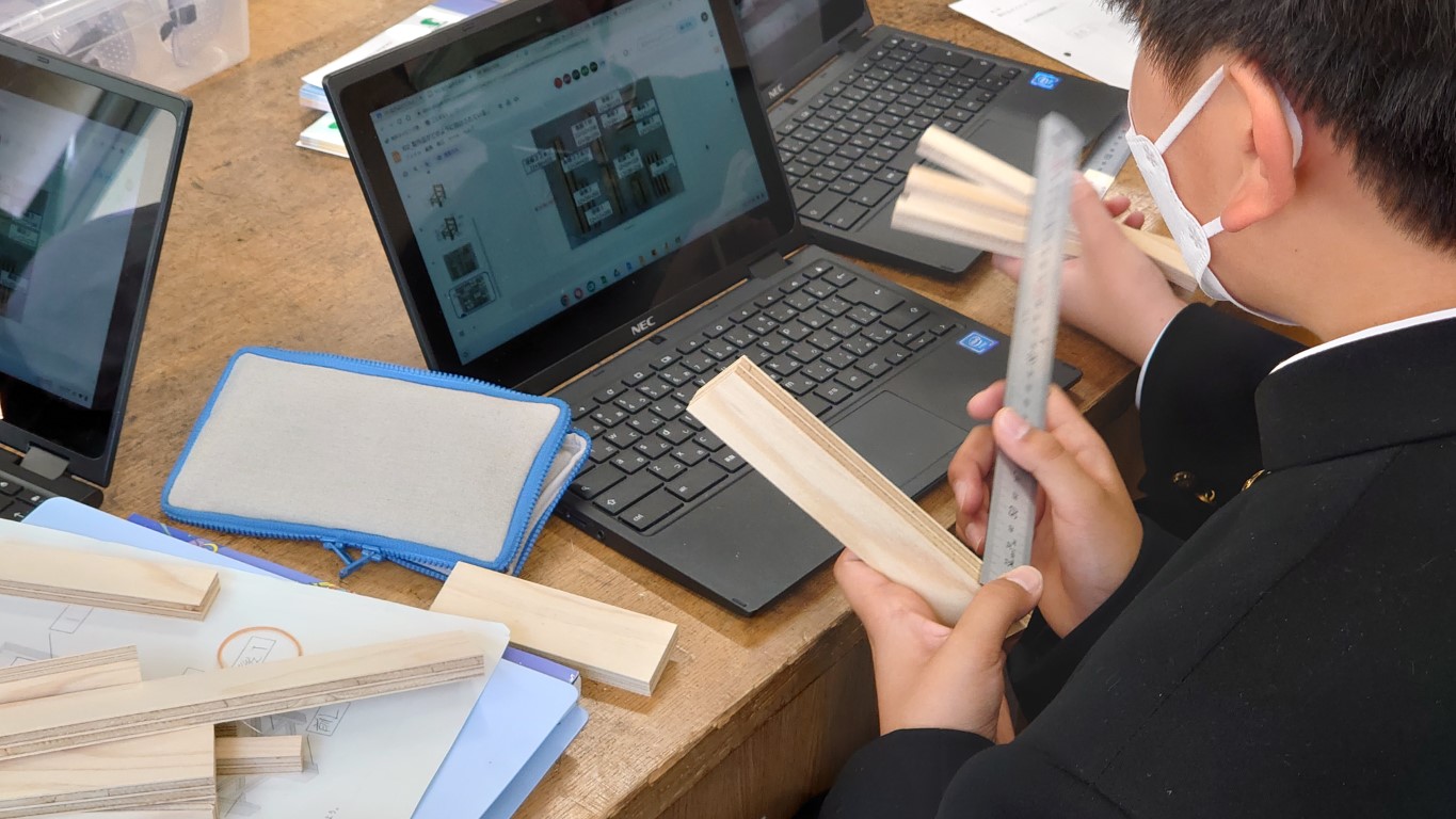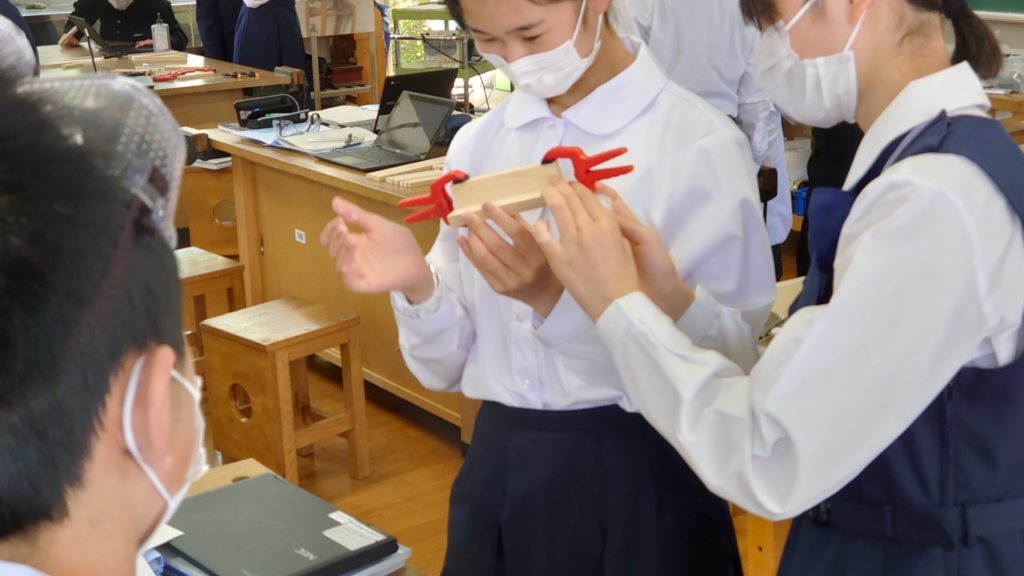 接着の仕方をワークシートやお手本の動画(こちらも生徒と共有している資料でChromebookで確認できます)などで確認を行いながら、各グループ慎重に取り組んでいる様子でした。 最後に、本日の振り返りを記入し、接着した材料(圧締したままの状態)を所定の位置に保管して、本日の学習は終了です。
