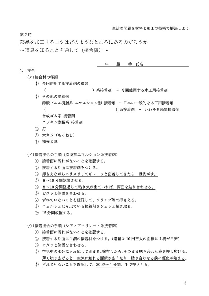 今年度からはタイトボンドの「クイック&シック多用途接着剤」を利用します。こちらの接着剤は粘度が高く、赤ラベルのタイトボンドと比較しても垂れにくいといった特徴があります。 接着剤には瞬間接着剤など、何種類も種類があり、用途によって使い分けることを説明します。今回使用する接着剤のラベルを確認し、接着剤の種類をワークシートに記入します。