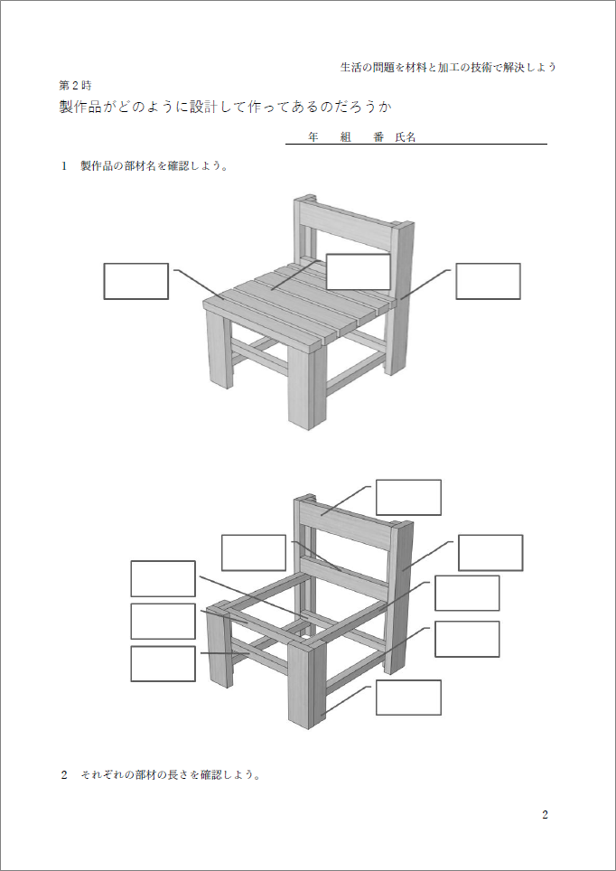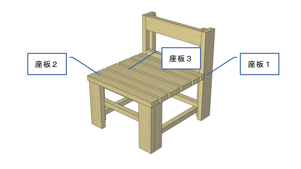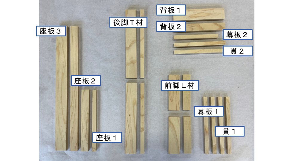まずは、上のスライド1で示しているのが「座面」、「座板」といった名称の材料であると示し、ここではこの材料に幅の違う3種類の木材が使用されていることも伝えます。