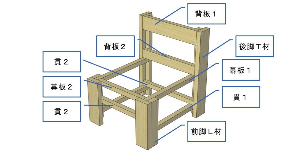 (座面を支える部材が「幕板」で、地面に近い脚を繋ぐ部材は「貫」になります)