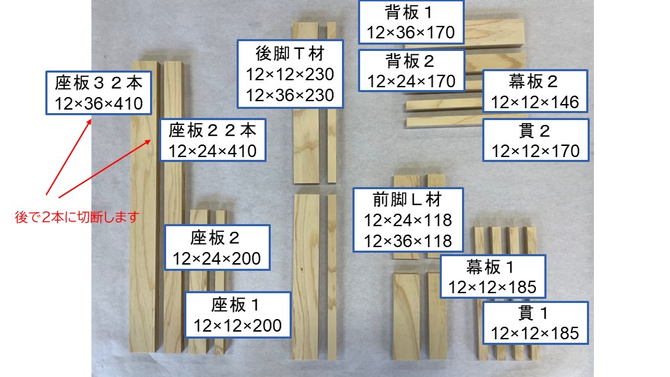 スライドには12x24x140といった記載をしていますが、この数字の意味(厚さx幅x長さ)についても伝えます。また、Kismトライアルはあらかじめ必要な長さに**カット済み(プレカット)**ではあるが、座面の部材については切断加工が必要であると示します。