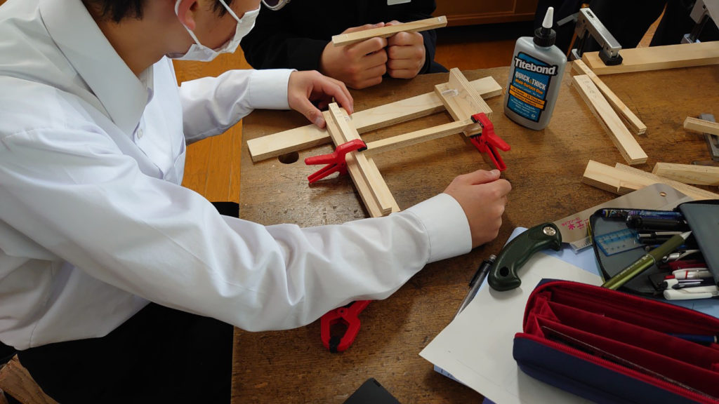 生徒たちは、正確に、精度よく組立てようと、試行錯誤を行っています。机上で並べて直角、位置を確認しながら接着剤を塗布し接着します。この後、圧着するためにばねクランプで挟まないといけませんが、材料を持ち上げると位置がずれたり、ばらけてしまい、苦戦をしていました。 この点について、当協会メンバーでは