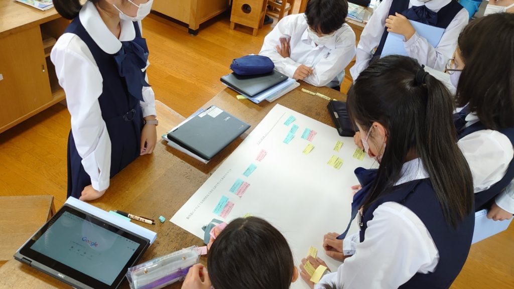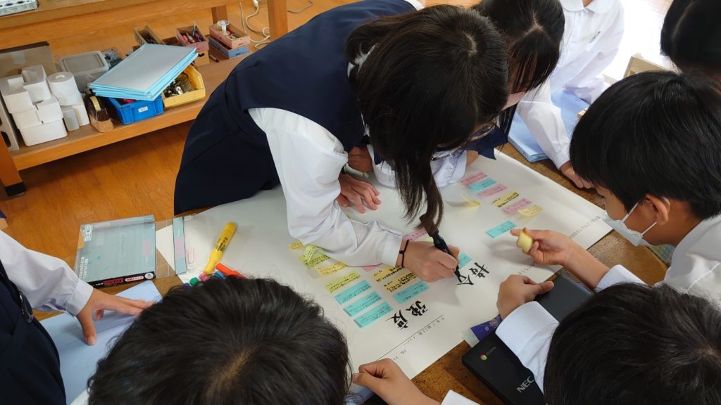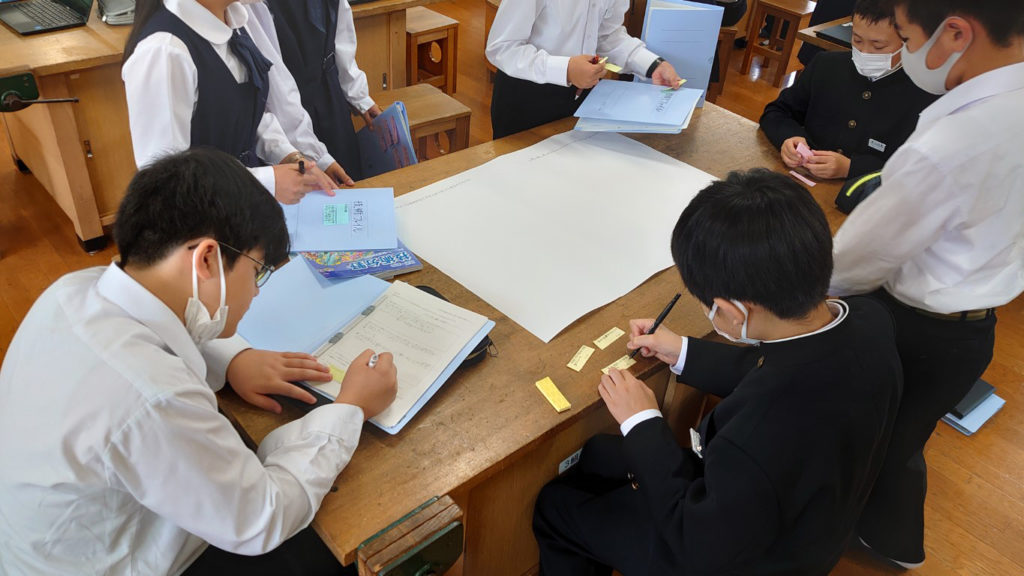 Googleクラスルームにアップした写真をプロジェクターで映しながら、グループでまとめたことを発表します。今回の授業では、残念ながら発表まで進むことができず、次回に持ち越しです。