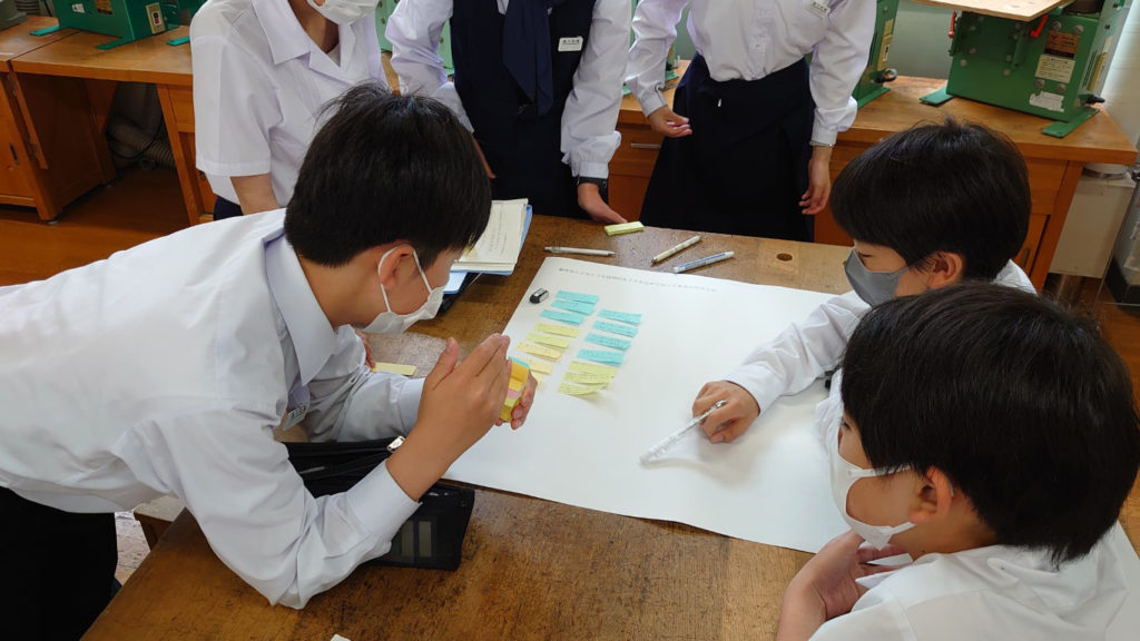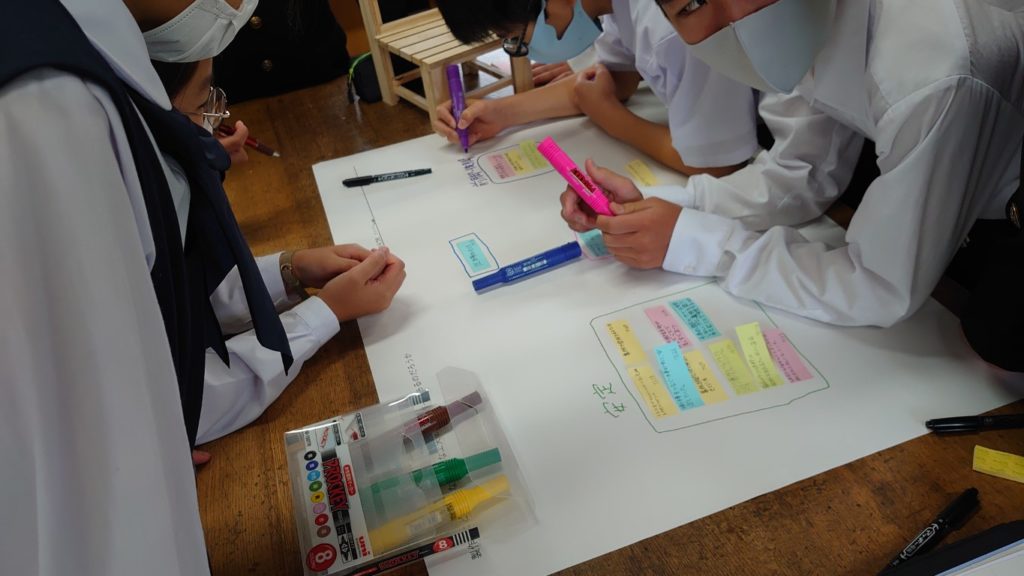書き出した付箋紙は模造紙に貼り付けながらグループで発表を行います。まだ、分類はせず、各自の気づきを発表します。この発表のときに、感じたことがあれば追加で付箋を記入していきます。グループワークでは机の上を整理して、広く使えるように促します。