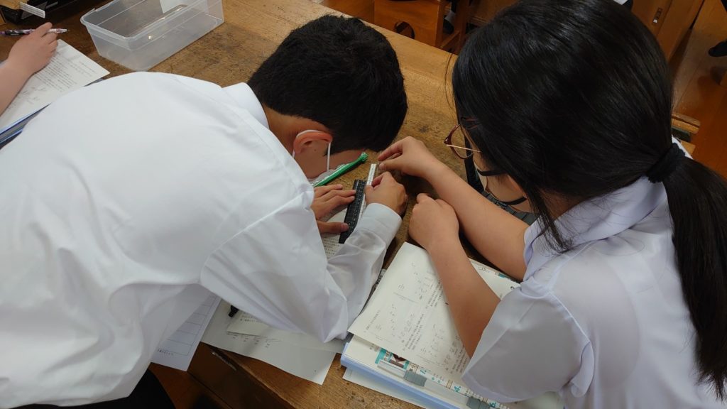 といった意見がでました。一番小さい試料を基準に、幅が2倍、3倍と変化していることに着目させます。 いよいよ実験に入ります。