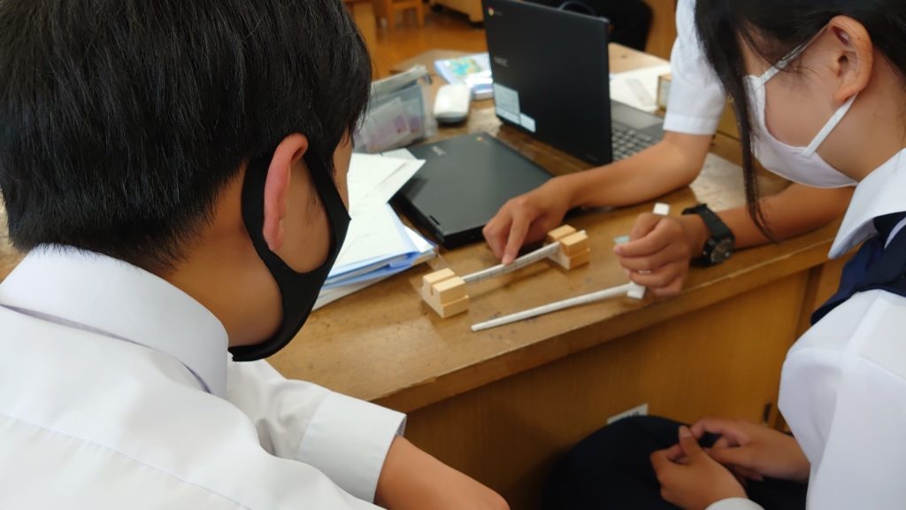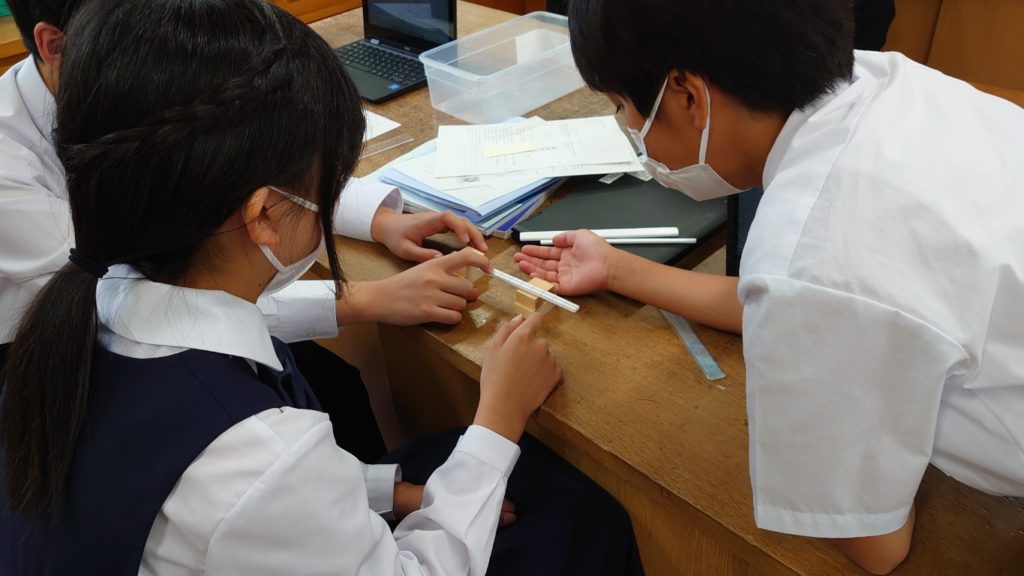 治具の間に試料を幅広の状態で渡して、中央を**「弱い力で徐々に押して」**、強度の違いを一人ずつ体感していきます。 **「弱い力で徐々に押して」**と、再三説明してもなかなかできない子供たちもちらほら。力を加えすぎて折ってしまうグループも見受けられました。折れると次の実験が出来ないことの説明、試料には予備を用意し、折れたらすぐに報告、交換といった指導も必要かもしれません。