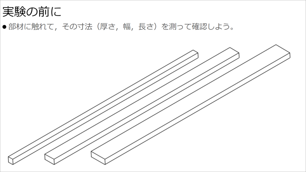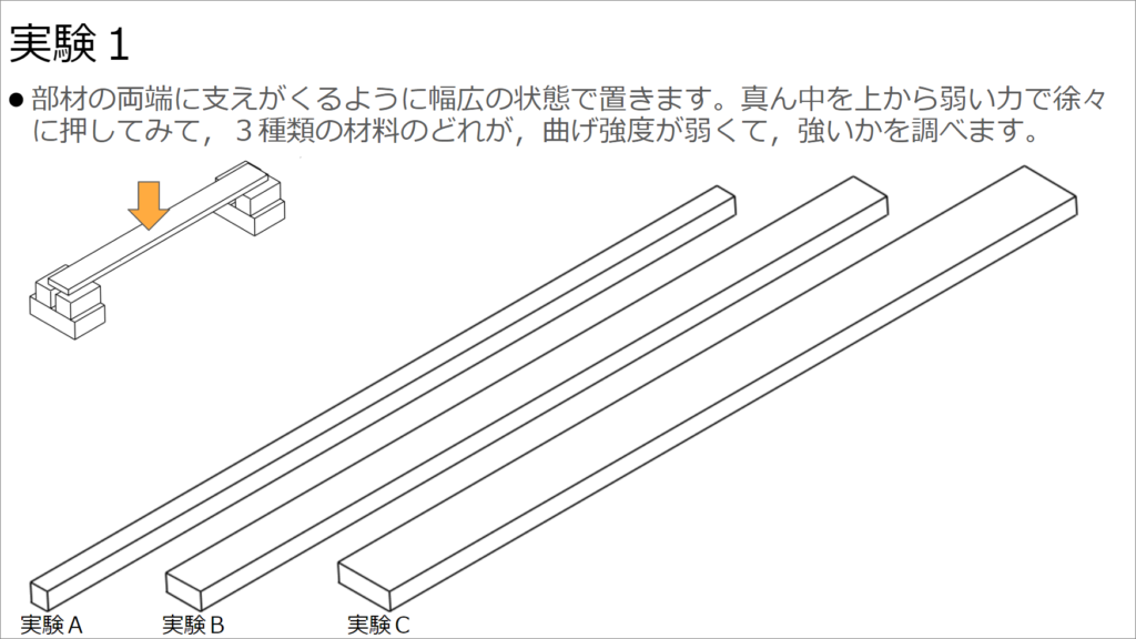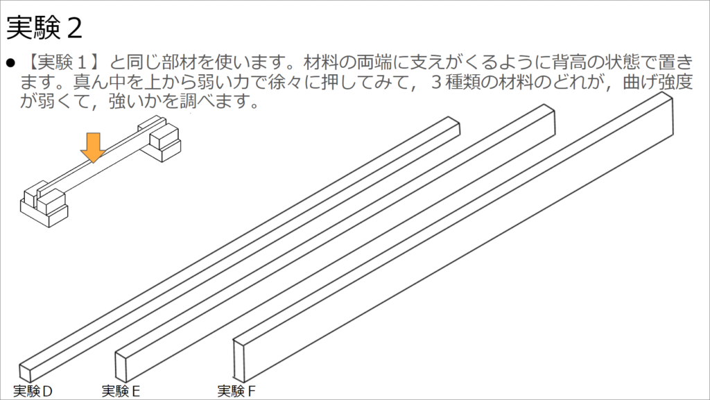 実験を始める前に、前時までの授業で材料には「強度異方性」あるいは「強度等方性」があるということを説明したことを思い出してもらいます。スチレンボードはどちらになるか問いかけてみます。スチレンボードは製品にもよりますが、ほぼ「強度等方性」ですね。