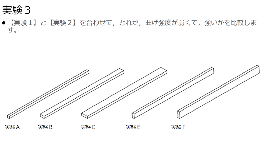 Aが最も弱く、Fが最も強いは全員一致の意見でした。 次に弱いのがBという意見もほぼ全員一致。問題はCとEで、意見が分かれました。 再度、CとEの強度を体感して確認するよう促します。確認後に意見を聞くと、Eが強いような気もするけど微妙といった意見もありました。 この試料の状態の違い(幅の違い、高さの違い)により強度が異なることを確認します。 また、BとEの試料は同じ体積(切断面積)であるのに、強度に違いがあることを確認します。