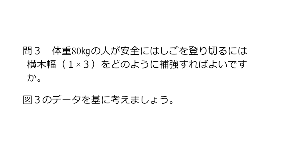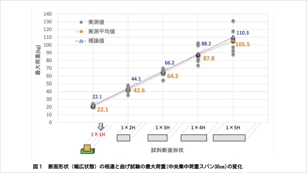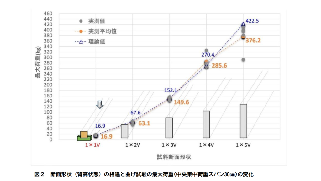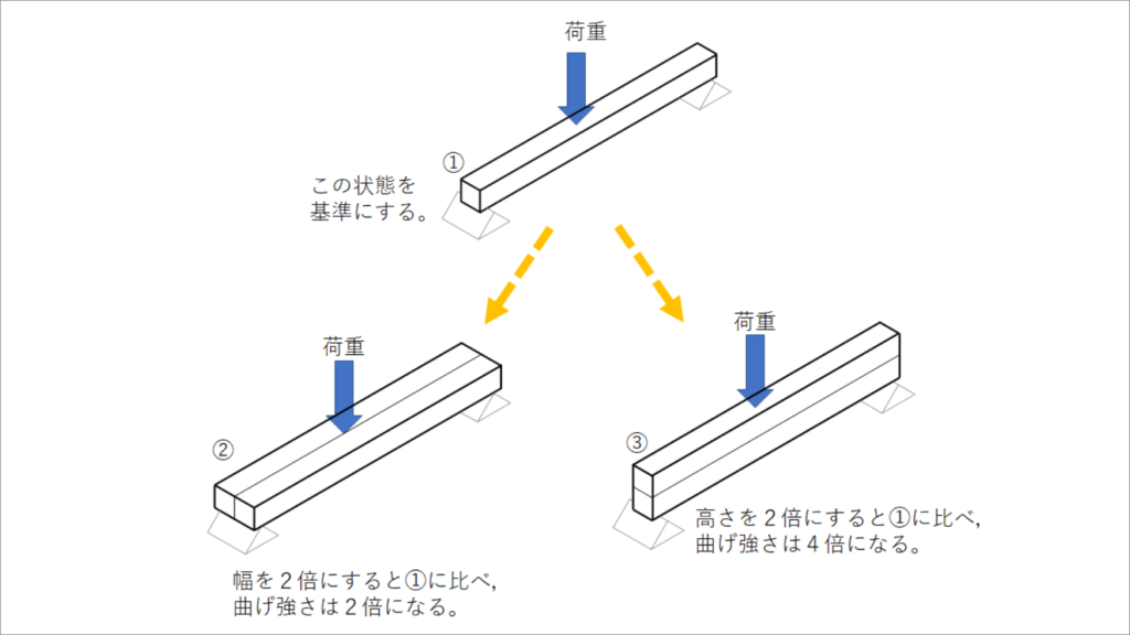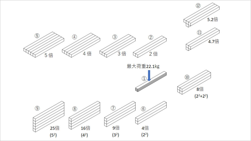 例) ・幅広に横木を置く場合、1x2でも耐えられるけど、少し安全をみるなら1x3材を使うと良い。 ・背高に横木を束なら、1x2が67㎏まで耐えられるので、十分だ。など
