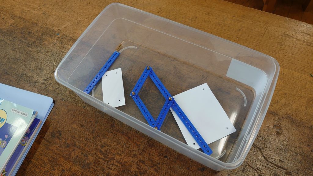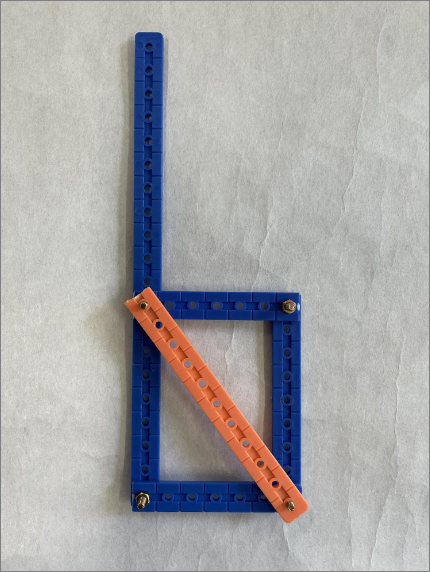 次に実験1で締めた金具を一旦緩め、部材を加えて、三角形構造に組み合わせてみて、どの程度構造として強くなるか確認してみます。