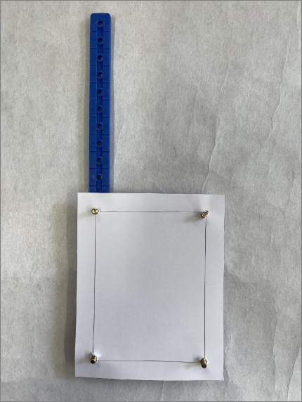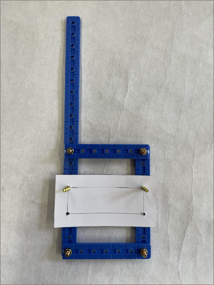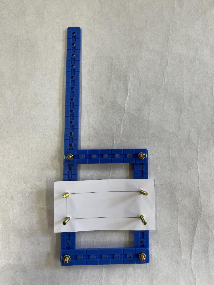 実験2で加えた部品を外し、別の幅のある部材(厚紙でできています。素材としてはペラペラで強度のある部材ではありません。)を加え、片側を1箇所ずつとめてみて、どの程度構造として強くなるか確認してみます。
