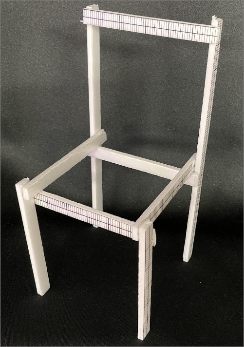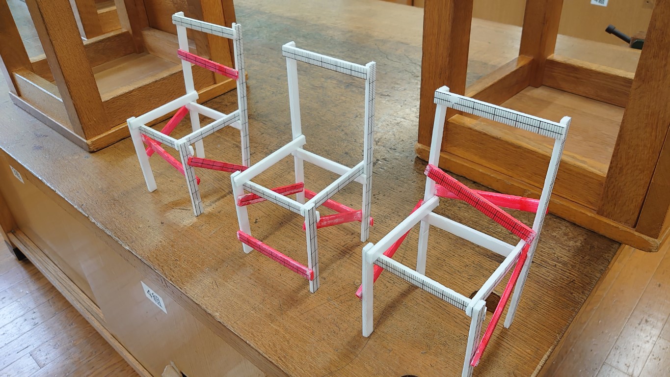 スチレンボードの椅子に部品を追加して、椅子の補強を試みてみます。変形を軽減させ、破壊を防ぎ、丈夫な椅子にするためにどの部分をどのように補強するかを考えます。追加に利用できる部品は4つだけとし、どの部分が弱く、どのように補強すると効果的かを考えます。身の回りにある製品なども参考にするよう促します(技術室の椅子や筋交いといった構造など)。補強に使うパーツは両面テープで実際に貼り付けて、効果を確認します。