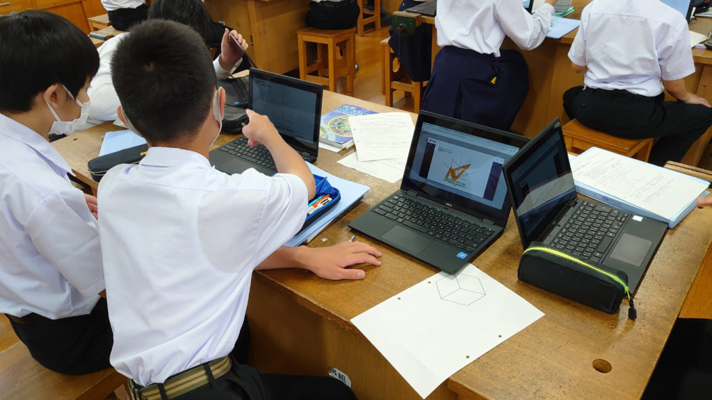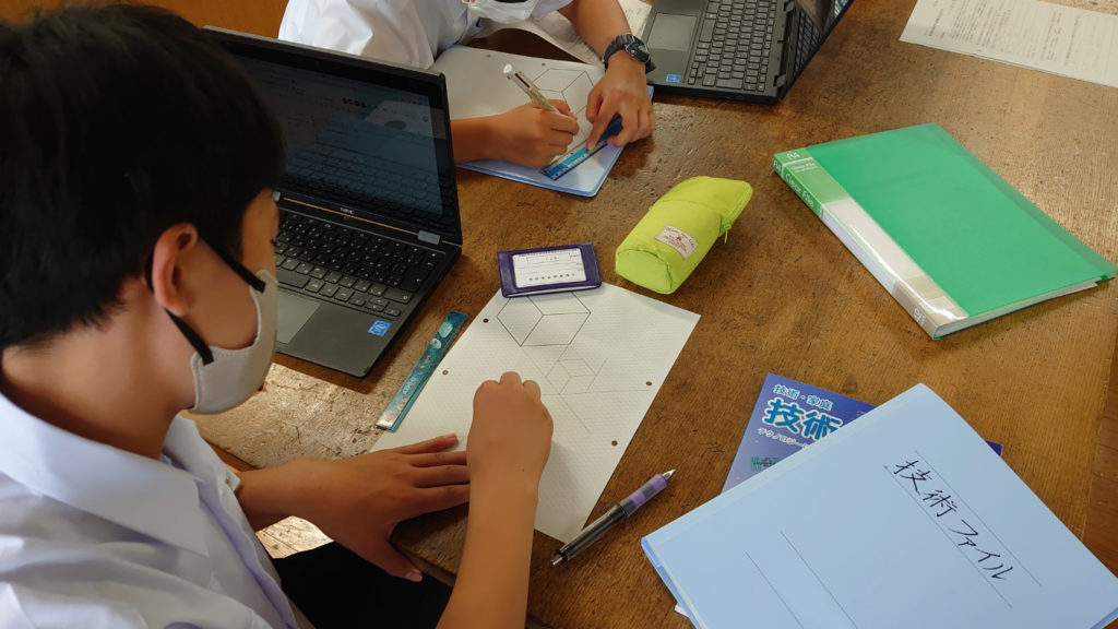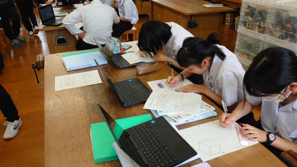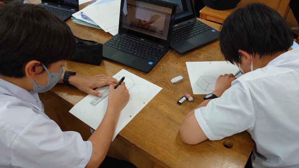 早速、等角図をかく練習を行います。ワークシート(斜眼紙)を配布し、単純な立方体をかく練習を行います。等角図のかき方は各自がChromebookを使って動画を視聴し確認します。