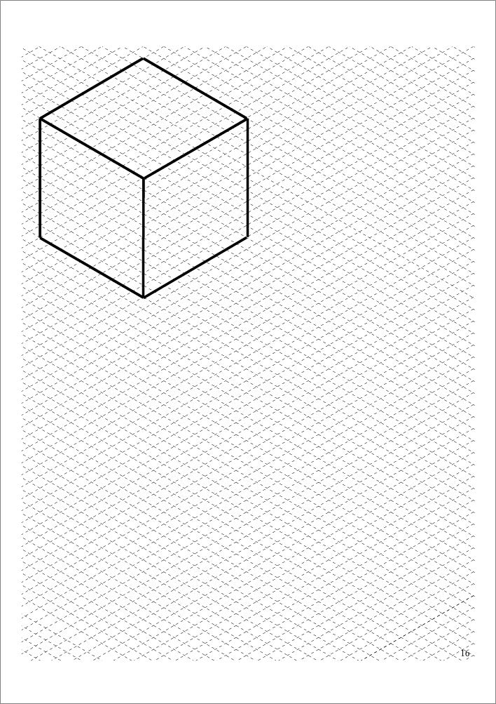 動画では、斜眼紙のように升目のない真っ白な紙に三角定規を使って等角図をかく例を示していますが、斜眼紙の場合は升目がありますので、普通の定規があれば等角図を描くことができますね。