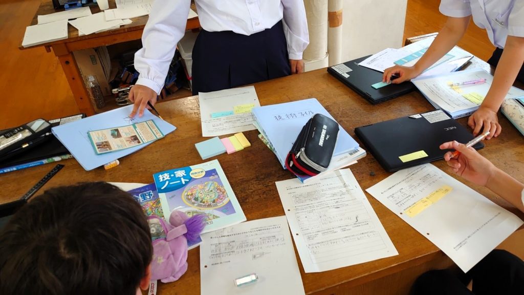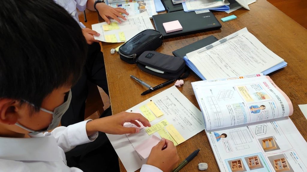 観察していると、多くの生徒が構造についての意見に流れがち(仕切りがいるとか箱にするとよいとか)に感じました。収納などの家具を検討する際は、何をどれくらい、どのような大きさのものを収納するのかといった観点も欲しいところ(授業の冒頭で説明していましたが…)ですが、なかなかそこまでの意見はでてこない印象でした。どうしても作りたいもののイメージ(や構造)に意識がいってしまっているのかもしれません。 それでも中には、収納などを置く場所や広さに着目する生徒や、周辺の環境(安全性)などに着目する生徒も見受けられました。