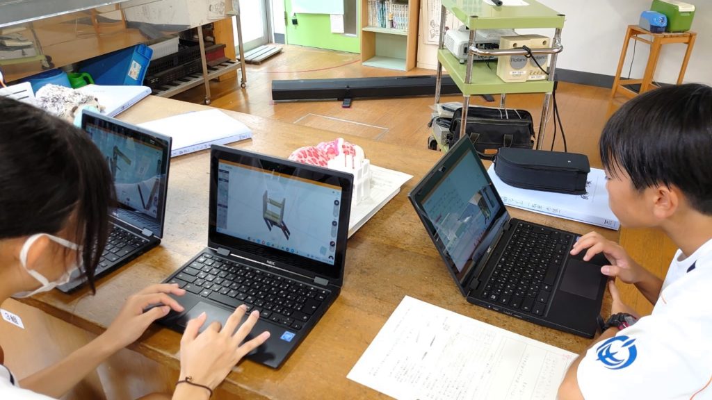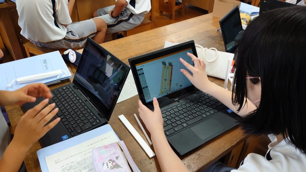と、その前に、CADアプリケーションのアップデートを行います。この夏休みの間に合板の積層面が表示できる機能が追加されました。積層面の表示を確認した生徒たちからは 「おー」っといった声も聞こえました。 制約事項に「積層面同士を接着しない」がありますが、設計段階から積層面を意識することが出来そうです。