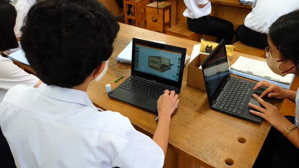 第2案の設計ができたら、Googleクラスルームに設計図を提出します。クラスルームに提出された設計図は先生がチェックし、コメントを返します。コメントをもらった生徒は、そのコメントを設計図に反映し、第2案の設計を完成させます。第2案の設計が完成したら、もう一度スチレンボードでの模型製作を行います。