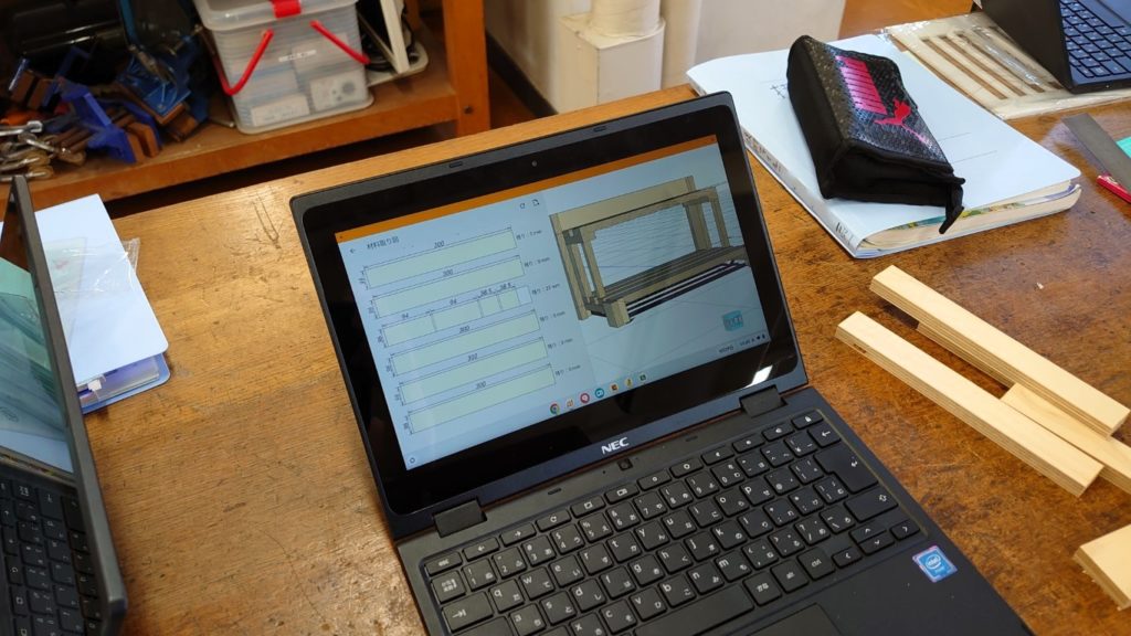 授業で使っている3DCAD(caDIY3D)には材料取り図を表示する機能があります。Chromebookの画面をのぞき込みながら、カットする部材の長さが間違っていないか、 何度も確認しています。 設計から製作に至るまで、紙への印刷というのは存在しなくなっています。 タブレットPCの有効活用にもなっていますね。