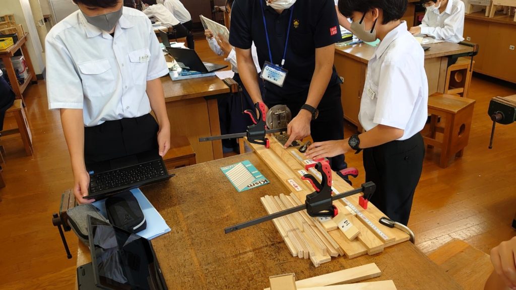 ここ最近は、設計と試作の繰り返しを行っているのですが、進捗もバラバラになってきています。まだまだスチレンボードによる試作をしている生徒もいれば、設計を纏めて、困りごとを抱えている人へのプレゼン資料を纏める生徒。さらに、製作の承認を得た生徒はKism(合板DL・モジュール木工キット)を使った製作に入っていきます。一人一人がマイペースで授業を進めている風景も、私たちが学生だった頃の風景とは全く異なりますね。
