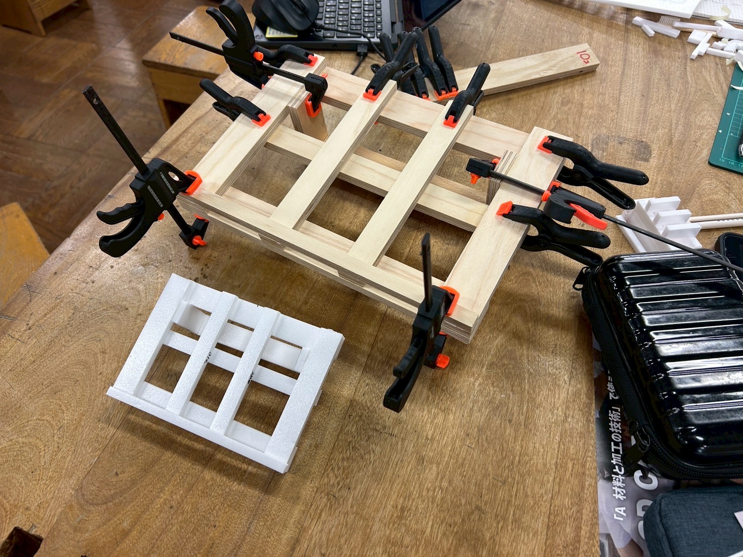 クランプで固定しながらの組み立て作業にも熱心に取り組んでいただきました。スチレンボードの試作と合板の本製作を見比べると、設計から製作までの一連の流れがよくわかります。