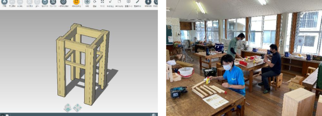 今回はあらかじめ設計したスツールの製作を体験して頂きました。 3DCAD上で貫の位置を調節していただき、製作に反映してもらいました。 製作の早い方は座板を集成材で作られたり、合板を貼り合わせたりして作られていました。