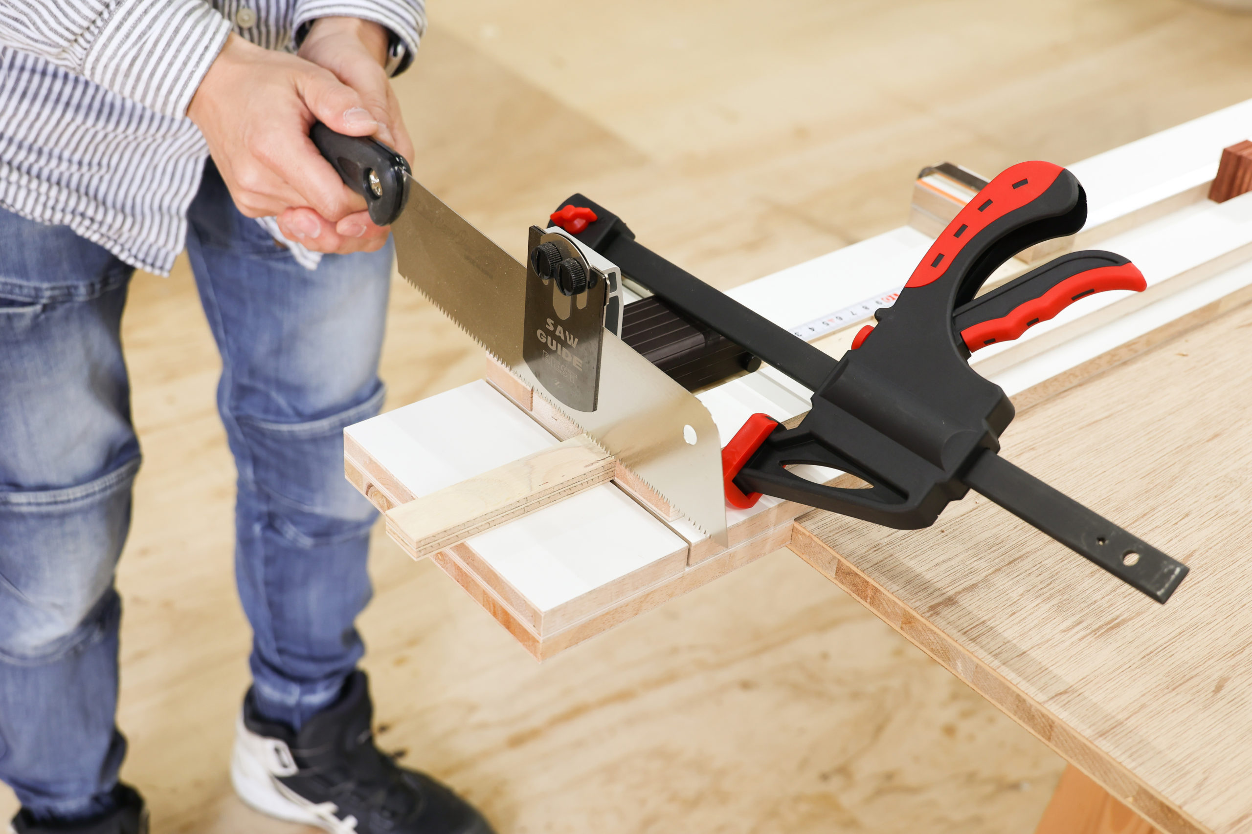 スケールが備え付けられているので、誰でも設定した寸法で確実に、また安全に切断が出来ます。加工ミスによる時間や材料の無駄、ケガなどのリスクがなくなり正確な製作が可能になります。2024年版では目盛りをネジ式メカニズムに変更し、材料固定クランプもリデザインされ、調整精度と耐久性が向上しています。