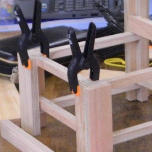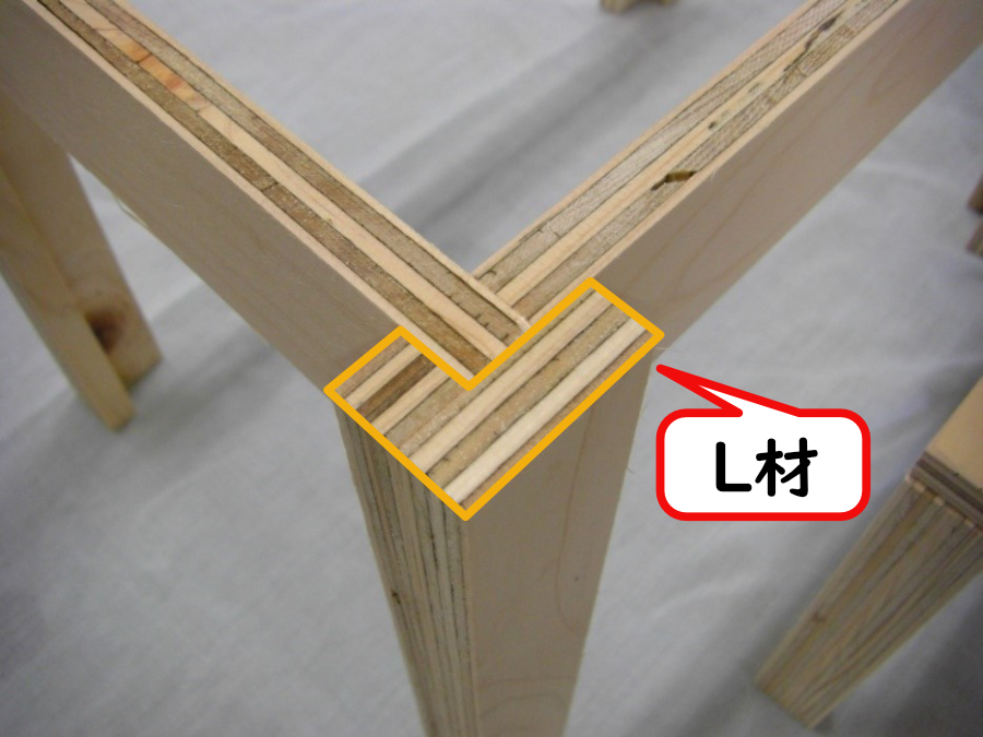製作学習では、まず構造材の脚となる「L材」を製作するところから始めます。L材は、二種類のDL材(例:1×1材と1×2材)を接着剤で圧着して作ります。