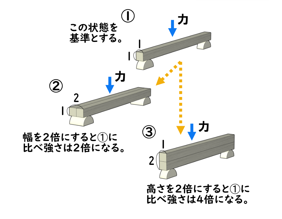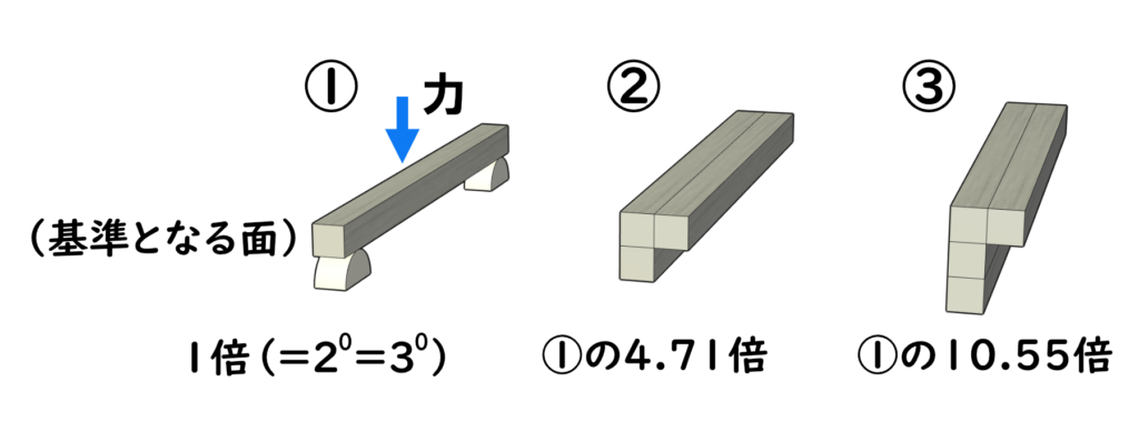 上の図は、合板DL材の断面形状(1×1)を基準にして、幅や高さを整数倍したときの曲げ強さを比較しています。製作する構造物に必要な強度に応じて、適切な断面形状を選択することが重要です。