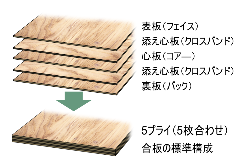 単板を奇数枚、繊維方向を直交させて重ね合わせ、接着剤で圧着させた改良木材 ―― それが「合板」です。