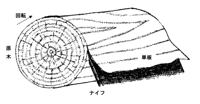 合板の原料は「単板」と呼ばれる薄い板です。原木を大根のかつら剥きのように回転させながら削り出すことで製造されます。