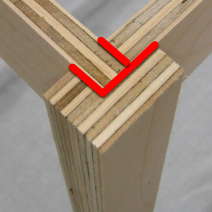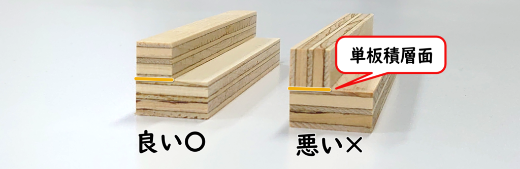 注意: 合板DL材(1×1)の単板積層面(木口面)を接着面にしてはいけません。積層面は接着剤を吸い込みやすく、十分な接着強度が得られない場合があります。上図の「OK」のように、平滑な面同士を接着面にしましょう。