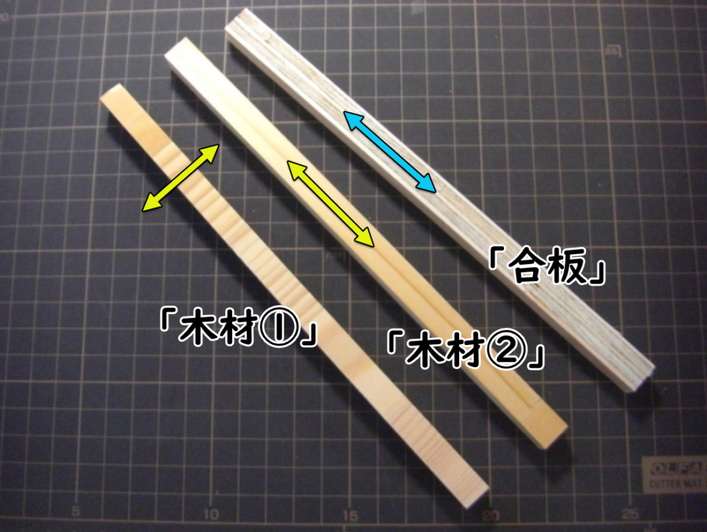 - 合板(直交積層)― 木材①と木材②の中間の強さ